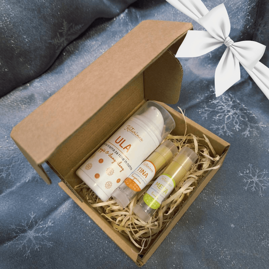 - Set 3: Krema za roke in nohte ULA + balzam za ustnice TINA (tangerina) + balzam za ustnice META (limeta)