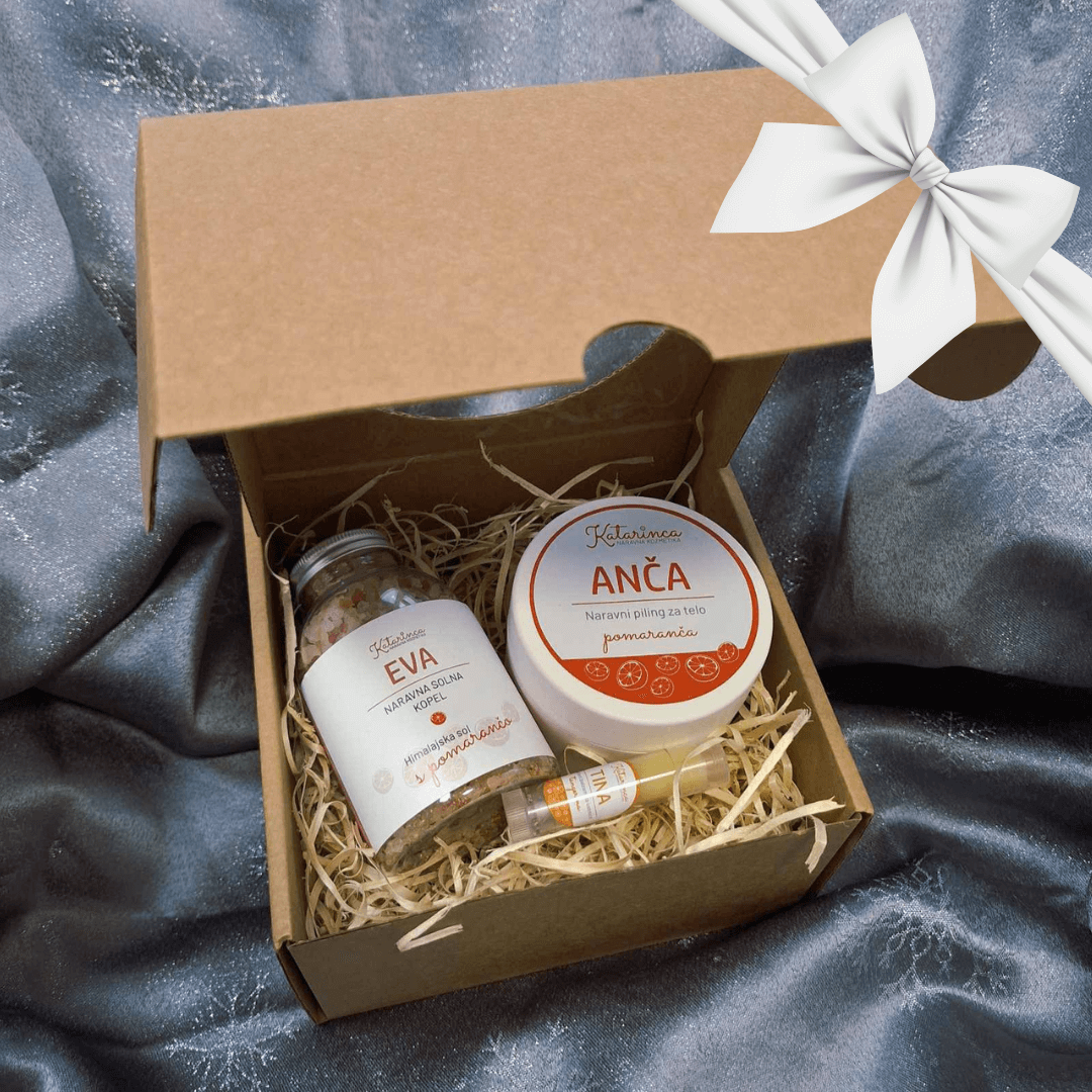 - Set 4: Sladkorni piling za telo ANČA (pomaranča) + solna kopel s himalajsko soljo (pomaranča) + balzam za ustnice TINA (tangerina)