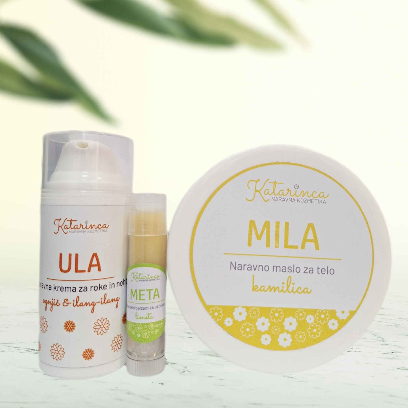 Set izdelkov za zimsko nego je idealen za suho, razpokano in občutljivo kožo telesa, rok in ustnic. Vsebuje naslednje izdelke: