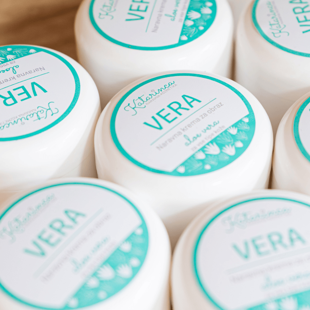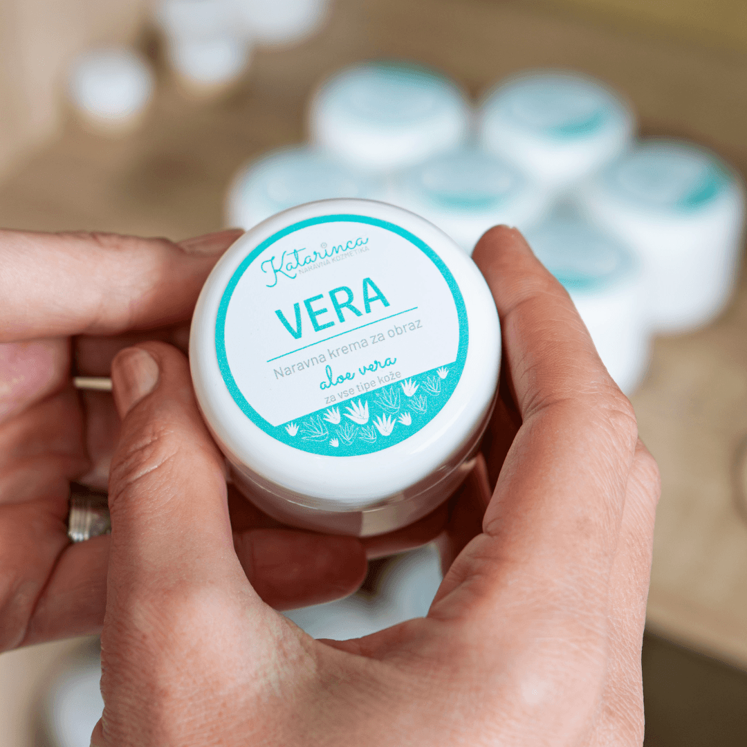 Naravna krema za obraz VERA z aloe vero je lahka in vpojna nega, primerna za vse tipe kože, od mladostne problematične do zrele in suhe kože. S svojo bogato in naravno formulo kožo intenzivno nahrani, prijetno navlaži ter ji pusti svilnat in osvežilen občutek brez mastnega videza. Zaradi skrbno izbranih naravnih sestavin, kot so aloe vera gel, mandljevo olje, kokosovo olje, čebelji vosek, vitamin E, eterično olje sivke, eterično olje čajevca in eterično olje limonske trave, je izdelek primeren tudi za nego občutljive in nečiste kože. Krema spodbuja naravno ravnovesje kože in zagotavlja vsakodnevno zaščito ter nego.